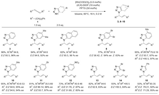 The benzotriazol-derived substrates (6–12) showed up to 96% yield and enantioselectivities up to 97% ee. While N1/N2-selectivity was consistently greater than 91:9 for symmetrically substituted triazoles (3, 6–8, 13, 14), asymmetric substrates added the challenge of N1/N3-regioselectivity. 5-substituted benzotriazoles (10–12) provided the corresponding products in an almost statistical N1/N3-distribution. Placing the methyl-group in 4- position (9) and thus closer to the reactive site increased N1/N3-selectivity to 4:1. Notably, there was a decrease of E/Z-selectivity for heterosubstituted benzotriazoles (8, 11, 12), whereas a nearly perfect E-selectivity was present in all other cases. The nitro-substituted benzotriazole (12) even led to an inversed olefine geometry, with the Z-product being preferred.