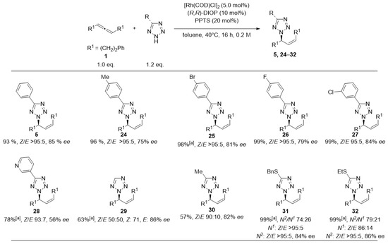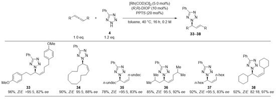 Halogen-substituted phenyltetrazoles were coupled in nearly quantitative yields (25–27). Tetrazoles containing thioethers (31, 32) were the only ones to yield products with reduced N2/N1-regioselectivity (about 3:1); however, maintaining quantitative yield and consistently high Z/E- and enantioselectivity. Eventually, we subjected several allenes to the reaction with 5-phenyl-tetrazole (4) (Figure 5).