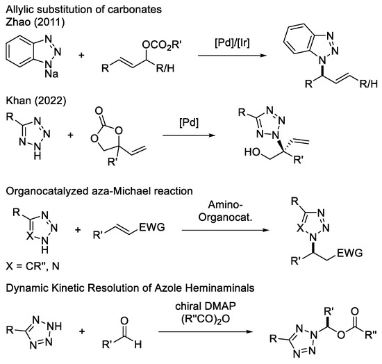 Due to the importance of these moieties, different strategies for obtaining them have been developed in the past (Scheme 1). Zhao and coworkers published the transition metal catalyzed allylic substitution with sodium benzotriazolide [13,14]. Despite the excellent enantioselectivities in some cases, the method lacks regioselectivity and requires deprotonation of the triazole in a previous step. Khan recently reported the allylic substitution of cyclic carbonates with tetrazoles [15]. However, allylic substitutions in general are not in accordance with the principle of atom economy by releasing stoichiometric amounts of waste [16]. A series of organocatalyzed aza-Michael additions overcomes this shortcoming and in some cases convinces with high selectivities, but the scope of these transformations is limited [17,18,19,20,21,22]. Furthermore, a three-component reaction of tetrazoles, aldehydes, and acid anhydrides should be mentioned, which uses a Dynamic Kinetic Resolution to synthesize α-chiral tetrazoles as hemiaminals [23,24].