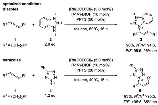 Coupling benzotriazole (2) with our screening allene, 1, resulted in 96% yield and perfect enantio-, regio-, and E/Z-selectivity by using [Rh(COD)Cl]2, (R,R)-DIOP, and 50 mol% of PPTS at 60 °C. Phenyltetrazole (4) was coupled at 40 °C and with 20 mol% PPTS with ideal regio- and Z/E-selectivity and good enantiomeric excess (Scheme 2) (For optimization and screening tables, see the Supporting Information).