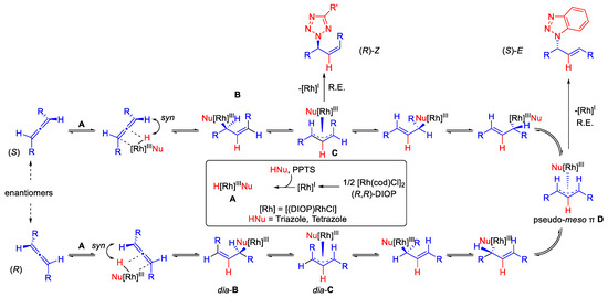 A RhI-DIOP complex is first formed from [Rh(COD)Cl]2 and (R,R)-DIOP (inner box of Scheme 4). With the help of PPTS, the pronucleophile is then added by oxidative addition to form the Rh-hydride species A. Now, syn-hydrometallation from the sterically less demanding side occurs at the respective allene enantiomers. This occurs in such a way that the hydrogen atom results at the former central atom of the allene. Initially, two diastereomeric Z-configured σ-complexes B and dia-B are formed, which are in equilibrium with their corresponding syn, anti-configured π-complexes C and dia-C. Finally, a σ-π-σ-isomerization and a bond rotation lead to the identical pseudo-meso-π-allyl complex D for both diastereomers. Dynamic kinetic resolution is ensured via this syn, syn-configured π-complex, since the initial hydrometallation products B and dia-B can be converted into each other via D. If a triazole is the pronucleophile in the catalysis, reductive elimination occurs of pseudo-meso-π-allyl complex D, with the chiral ligand ensuring enantioselectivity. In contrast, when a tetrazole is used as a pronucleophile, reductive elimination preferentially occurs from syn-anti-π-complex C. This could explain why the (S)-E product is formed for the triazole and the (R)-Z product for the tetrazole.