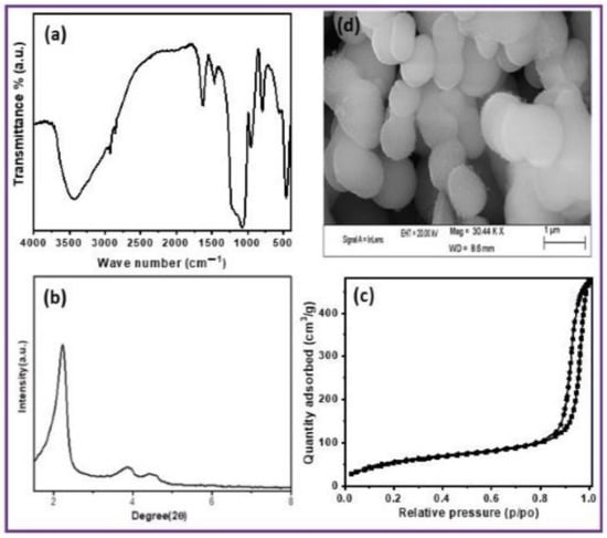 (a) FT-IR spectra, (b) Small-angle XRD pattern, (c) N2-sorption and (d) SEM image of 12.8-A- MCM-41-S catalyst (Scale bar = 1 µm).