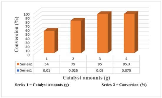 The amount of catalyst for the Knoevenagel condensation reaction under similar conditions was evaluated. The effect of 12.8-A-MCM-41-S catalyst loading on the Knoevenagel condensation reaction is illustrated in Figure 2. An examination of Figure 2 shows that conversion increases from 54 to 95%, increasing the catalyst from 0.01 g to 0.05 g. Then, the conversion marginally increases (only 0.3%), further increasing the catalyst amount.