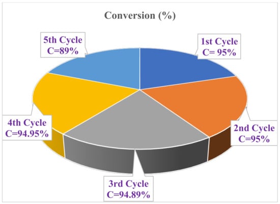 Under controlled circumstances, the 12.8-A-MCM-41-S catalyst was used in recycling tests for the Knoevenagel condensation reaction. After the initial cycle, the catalyst was recovered through filtration, washed with ethanol, and dried at 60 °C. The recovered catalyst was reused, and we continued recycling the material up to five times. Figure 3 illustrates the catalytic activity of the reused catalyst in consecutive cycles. Figure 3 shows that conversion efficiency (11%) decreases after the 4th cycle. The lowered efficiency may be due to catalyst poisoning by organic impurities.