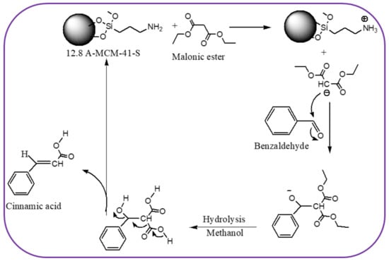 Scheme 1 depicts the probable mechanism of the Knoevenagel condensation process over 12.8 A-MCM-41-S catalysts. The amino group removes the proton from the diethyl malonate generating the diethyl malonate anion. Following the hydrolysis of the intermediate in the solvent phase, the diethyl malonate anion interacts with the carbonyl carbon of the modified aldehyde to produce the main product, cinnamic acid.