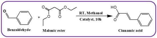 Initially, 10 mmol of benzaldehyde, 10 mmol of malonic ester, and 0.05 g of catalyst were taken in the reactor and stirred at room temperature in an oil bath. After 10 h of reaction, 50 mL of methanol was added to soluble all the organic compounds. Then, the mixture was stirred for 10 min (Scheme 2). The catalyst was recovered by centrifugation, and offline GC analysed the reaction mixture.