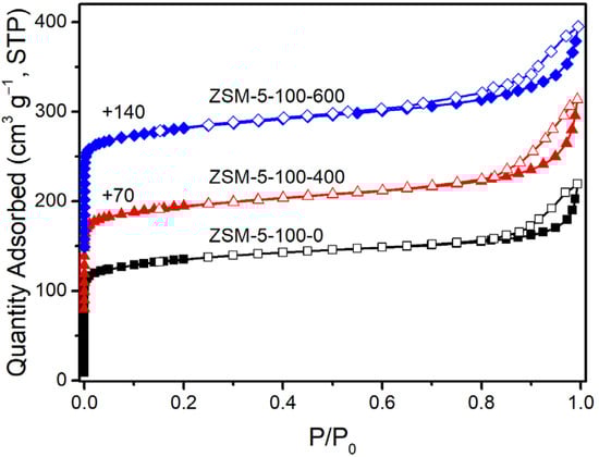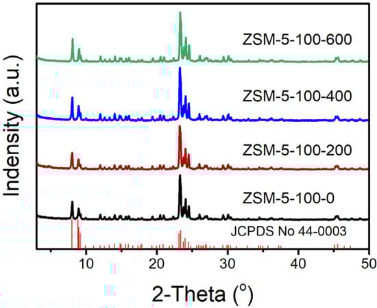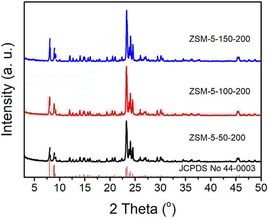 Hierarchical ZSM-5 samples were synthesized in a toluene/water mixture according to an initial gel molar ratio of xAl2O3:100SiO2:36TPAOH:2000H2O:y toluene (x = 0.3, 0.5 or 1; y = 0, 200, 400 or 600). In a typical synthetic batch, SDA, the aluminum source (Al(i-PrO)3, Al2(SO4)3·16H2O, AlCl3·6H2O) and the silicon source were added to deionized water in turn. After vigorous stirring for a certain time, a colorless, transparent homogeneous solution was obtained and named solution A. Next, solution A and an amount of toluene were simultaneously added to a Teflon-lined stainless-steel autoclave to undergo crystallization in a drying oven at 423 K with a rotational speed of 60 rpm for 72 h. After crystallization, the autoclave was rapidly cooled to room temperature by rinsing with tap water. The white solid product was obtained by centrifugation at 10,000 rpm for 10 min, followed by washing with deionized water to neutral and drying in a convection oven at 353 K for 8 h. Finally, the dried solid product was ground and placed in a muffle oven to calcinate at 823 K for 8 h in an atmosphere of air to remove residual SDA. The synthesized solid product is denoted as ZSM-5-x-y, where x and y represent the Si/Al ratio of the initial gel and the added amount of toluene, respectively.