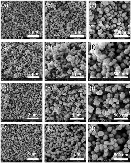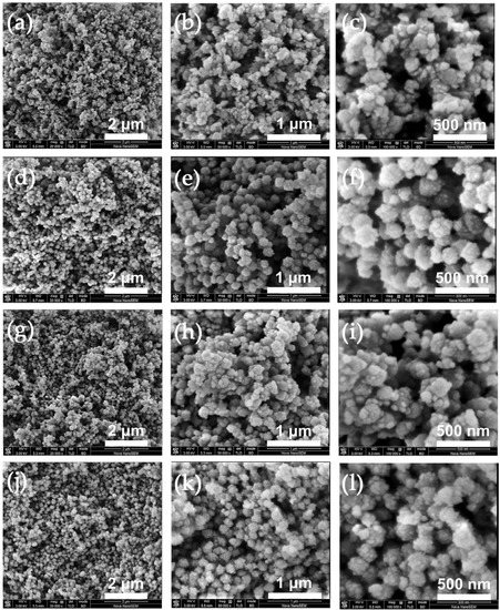 FE-SEM micrographs of ZSM-5 with Si/Al ratios of 50 and 100 synthesized with different Al sources. ZSM-5-50-200 (a–c) and ZSM-5-100-200 (d–f) synthesized with AlCl3·6H2O; ZSM-5-50-200 (g–i) and ZSM-5-100-200 (j–l) synthesized with Al2(SO4)3·16H2O.