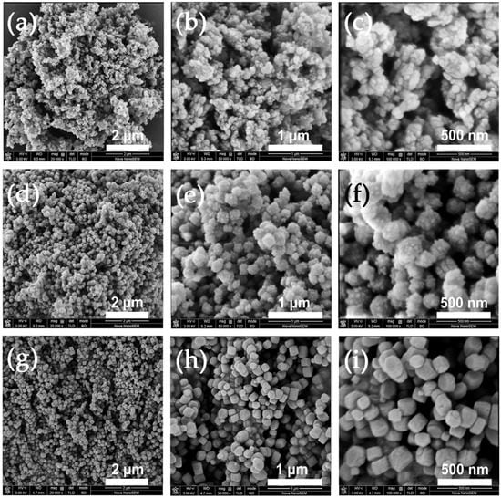 FE-SEM micrographs of ZSM-5 with different Si/Al ratios: (a–c): 50; (d–f): 100; (g–i): 150.