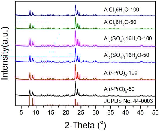 Tetraethyl orthosilicate (TEOS, 98%, Shanghai Aladdin Biochemical Technology Co., Ltd. Shanghai, China) and silica sol (40% in water, Shanghai Kaiyin Chemical Reagent Co., Ltd., Shanghai, China) were selected as the silicon source; aluminum isopropoxide (Al(i-PrO)3, 98%, TCI), aluminum sulfate hexadechydrate (Al2(SO4)3·16H2O, 98%, Shanghai Aladdin Biochemical Technology Co., Ltd., Shanghai, China) and aluminum chloride hexahydrate (AlCl3·6H2O, 98%, Shanghai Aladdin Biochemical Technology Co., Ltd., Shanghai, China) were used as the aluminum source; tetrapropylammonium hydroxide (TPAOH, 40.0 wt.% in water, Shanghai Titan Reagents Co., Ltd., Shanghai, China) was used as the structure-directing agent (SDA); and deionized water and toluene (99.8 wt.%, Shanghai Aladdin Biochemical Technology Co., Ltd., Shanghai, China) were used as the synthetic solvent. All synthetic raw materials were used without further purification.