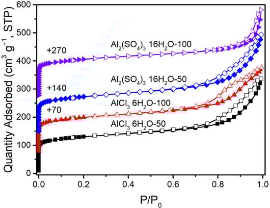 N2 physisorption isotherms of ZSM-5 with Si/Al ratios of 50 and 100 synthesized with different Al sources.