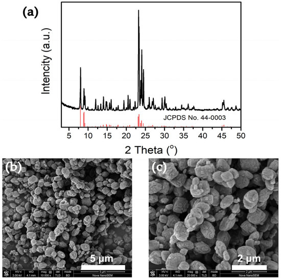 XRD patterns (a) and FE-SEM micrographs (b,c) of ZSM-5-100-200 synthesized with silica sol.