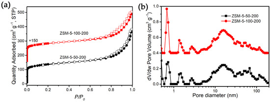 N2 physisorption isotherms (a) and pore-size distribution obtained by the NLDFT method using the adsorption branch of the isotherm (b) for ZSM-5-50-200 and ZSM-5-100-200.