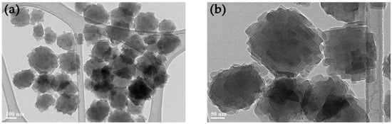 Next, the systematized physicochemical properties of two representative samples, ZSM-5-H-50-200 and ZSM-5-H-100-200 synthesized with Al(i-PrO)3, were further characterized. TEM micrographs (Figure 11) of ZSM-5-100-200 indicated that spheroidal particles directionally accumulated in molten clusters with a size of about 33 nm in width and 70 nm in length. In addition, the black and white contrast indicated the presence of intercrystalline meso- or macropores. Directional accumulation alignment and growth are often an indicator of the history of directional attachment growth [29]. The textural properties of ZSM-5 samples were further obtained by measuring N2 adsorption–desorption isotherms, as shown in Figure 10, and the corresponding calculated data are summarized in Table 1. When the relative pressure P/P0 < 10−3, the uptake curve of both samples exhibited a very steep rise owing to micropore filling. In addition, there was another jump at P/P0 > 0.85 accompanying a hysteresis loop in the isotherm, which was attributed to the capillary condensation of N2 molecules in the interlayer mesopores or macropores formed by the accumulation of primary particles. The isotherms had both type I and type IV characteristics, indicating that the material contained both micropores and secondary meso- or macropores simultaneously. The surface area was 508 m2 g−1 and 495 m2 g−1 for ZSM-5-50-200 and ZSM-5-100-200, respectively. In addition, the distributions of pore sizes also showed the existence of a large number of interlayers mesopores and macropores in ZSM-5 samples (Figure 11b). Compared with ordinary NaZSM-5 [30], ZSM-5 synthesized by phase transfer had a larger specific surface area, mainly accounting for the increase in the external surface area and mesopore volume, which is consistent with the SEM and TEM results.