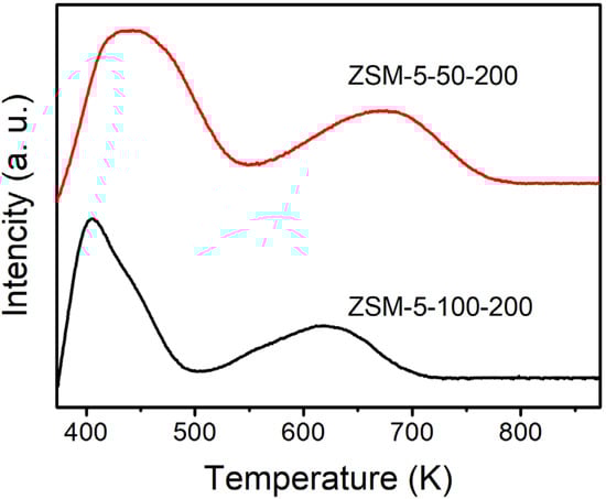 NH3-TPD profile of ZSM-5-50-200 and ZSM-5-100-200.