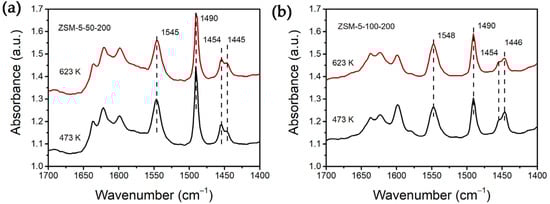 Py-IR profile of ZSM-5-50-200 (a) and ZSM-5-100-200 (b).