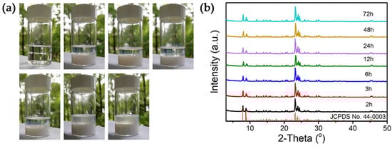 (a) Time-dependent digital photographs of ZSM-5-100-200 after standing for 0.5 min and (b) XRD patterns of the corresponding solid products collected at different time points in the course of the crystallization process.