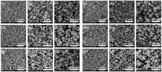 FE-SEM micrographs of ZSM-5-100-200 in the course of crystallization process: (a–c): 2 h; (d–f): 3 h; (g–i): 6 h; (j–l): 12 h; (m–o): 24 h; (p–r): 48 h.