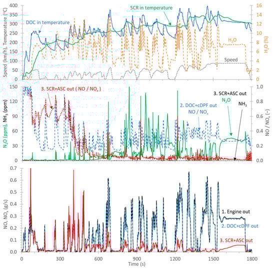 Figure 1 (lower panel) plots the NOx emissions over a cold start WHVC at 23 °C, separately for the three sampling positions: (1) engine out (black line), (2) DOC + cDPF out (blue lines), and (3) SCR + ASC out (tailpipe) (red lines). The middle panel gives the NH3 and N2O concentrations at the tailpipe (position 3) and the NO/NOx ratio for the two positions 2 and 3. The upper panel plots the speed profile, the exhaust gas temperatures at the DOC inlet and the SCR inlet, and the H2O concentration. Note that temperatures were measured at the three sampling positions stated above and we assumed that, given the closed-coupled configuration, differences between engine out and DOC in or DOC out and SCR in were minor. The pre-conditioning the day before was a high-load steady driving to passively regenerate the cDPF.