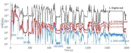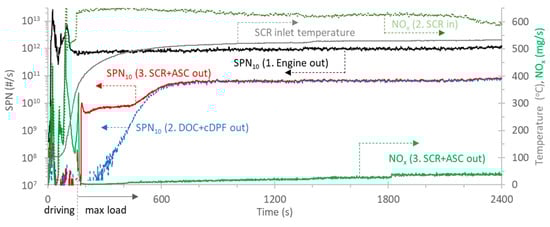 The engine out emission levels were high (black lines), while the DPF out emissions (blue emissions) were practically zero, except during cold start. Nevertheless, even during cold start, the DPF filtration efficiency was 85% (first seconds) to 99.5% (first minutes). It reached >99.9% after four minutes, in agreement with other studies []. The SPN23 and SPN10 lines were on top of each other, meaning that there were no particles <23 nm and that they were mainly soot particles. The high cold start emissions were due to the “empty” DPF at the beginning of the test (it should be reminded that the preconditioning the day before consisted of a long high-load test in order to passively regenerate the filter).