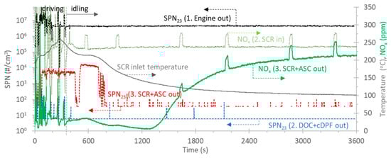Although there is no information regarding the urea injection, it can be assumed that urea was injected until a time of 700 s, because the particles downstream of the SCR were elevated compared to the upstream position (compare red and blue lines). As with the test in the previous section, this time also coincided with a temperature at the inlet of the SCR of at least 200 °C. The NOx emissions without urea injection from a time of 800 s remained low because the NOx reduction continued with the stored NH3 in the SCR. This has been shown and discussed in the literature []. The amount of stored NH3 available depends, among other things, on SCR volume and the previous operation. Another idling test (not shown) that followed a WHVC, instead of motorway driving as in Figure 3, maintained low NOx emissions for 20 min.