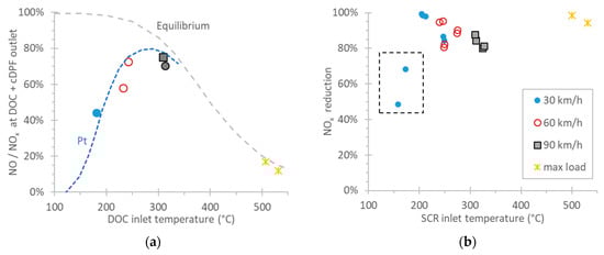 Figure 5a presents the NO to NOx ratios measured downstream of the DOC + cDPF (position 2) for a few constant speeds and the max load test (at 80 km/h) as a function of the exhaust gas temperature at the inlet of the DOC. The max load and high speed points lay on the equilibrium curve, which indicate the thermodynamic limitation for higher conversions. The other points lay on a typical NO to NO2 conversion curve for the Pt catalyst [,]. However, as the DOC formulation was unknown, the Pt curve is mainly an aid to the eye, rather than the expected performance of the catalyst.
