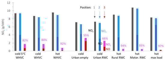 NOx emission factors for various cycles at different sampling positions of the aftertreatment system. When available, NO and NO2 are given with different color shading. Position 1 (engine out, grey bars); position 2 (DOC + cDPF out, blue bars); position 3 (SCR + ASC out, tailpipe, red bars). Percentages give emissions reductions compared to the previous position. Tests at 23 °C, except “cold 5 °C WHVC”, and 66% of maximum payload, except “Urban empty” (9%). “Cold” and “hot” refer to the coolant temperature at engine cranking, i.e., at ambient temperature or >70 °C, respectively. ASC = ammonia slip catalyst; DOC = Diesel oxidation catalyst; cDPF = catalyzed Diesel particulate filter; RWC = real-world cycle; SCR = selective catalytic reduction; WHVC = world harmonized vehicle cycle.