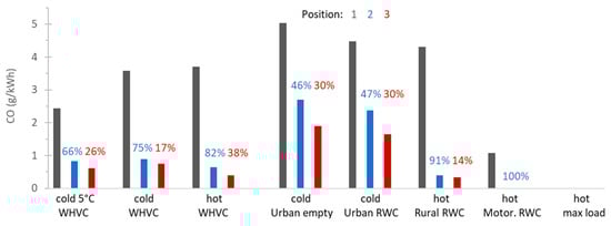 Figure 7 plots the CO emissions. The highest engine out emissions were during cold start cycles. The DOC and the catalyzed DPF oxidized most of the CO: from 2.5 to 5.0 g/kWh (position 1) to <1 g/kWh (position 2), with the exception of the cold start urban cycle (around 2.5 g/kWh). The efficiency for CO ranged from 46 to 100% The SCR reduced CO by 14–38% relative to the DOC + cDPF position (position 3). This reduction is likely due to the conversion of an equimolar amount of NO2 to NO, as also suggested by previous results discussed in Figure 1. The results are in agreement with other studies with Euro VI or China VI vehicles (around 1 g/kWh) [,] or lower [,].