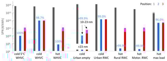 Figure 8 plots the SPN emissions. Both SPN23 and SPN10 are given for all three positions, but the difference is very small for the engine out (position 1) and DOC + cDPF out (position 2) and is, thus, indistinguishable in the plot. The cDPF efficiency was >98% (for cold start cycles), reaching almost 100% for hot start cycles. The reason for the relatively lower filtration efficiency of the cold start cycles is that the tests started with an “empty” cDPF and some time was necessary to fill the cDPF with some soot. The SCR operation resulted in an increase in the emissions of approximately 1 × 1011 #/kWh (position 3), as determined by the hot cycles where the DPF out emissions were very low. These results are in agreement with other studies [,,,].
