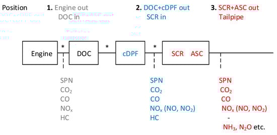 The results of the present study clearly demonstrated the need for further improvements of the aftertreatment devices for upcoming regulations with lower emission limits. For NOx, various solutions have been presented, requiring a closed coupled SCR in order to address the cold start NOx emissions [,]. Increased urea dosing might also be required, which will also lead to high particle number emissions. A second DPF at the end of the tailpipe seems a viable solution, as it was recently demonstrated [,]. The increased N2O emissions from the DOC, SCR, and ASC need optimization of the catalyst materials and formulations, system architecture, and the operating strategies, as its subsequent removal is challenging [,].