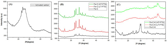XRD pattern: (A) activated carbon; (B) Fe-C catalyst, Fe-C LT-FTS, and Fe-C HT-FTS; (C) Fe-C-K catalyst, Fe-C-K LT-FTS, and Fe-C-K HT-FTS.