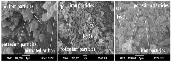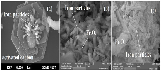 Scanning electron microscopy (SEM) images of activated carbon are shown in Figure 2a,b, demonstrating that its interior surface is riddled with voids. These chambers are upright to allow for the development and provision of iron particles, resulting in long-lasting contact between carbon and iron particles.