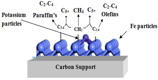 Table 3 shows that adding potassium promoter in an iron carbon-supported catalyst has a substantial impact on the conversion of gasoline, from 36.4 percent (Fe-C) to 72.5 percent (Fe-C-K). A low potassium concentration is thought to be beneficial for promoting the FTS reaction and converting iron carbides to the inactive iron oxide phase. Potassium offers a number of benefits, including increasing the quantity of alkenes in hydrocarbon synthesis, and inhibiting the creation of methane [31]. In general, using a potassium promoter in conjunction with an Fe/Ac-based catalyst reduces the quantity of n-paraffins in FTS products while significantly increasing branching paraffin [32]. When promoters are added to an iron-based catalyst, the catalyst’s physical and chemical properties change, as well as the conversion and selectivity of CO2 and C5+ [33]. The support of carbon helps for the formation of the iron-carbide phase. Due to the iron-carbide phase, the conversion rate of gasoline and diesel was increased. The Figure 6 shows the mechanism of a carbon-supported iron catalyst containing potassium as a promoter.