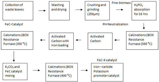 By incorporating 10% iron nitrate (3.2 g Fe (NO3)3.9H2O) and 4 g of “Lantana Camara”-activated carbon, the Fe-C sample was prepared. The sample was then calcined for three h at 350 °C in a box resistance furnace [48]. The prepared Fe-C catalyst was mixed with 3 wt% potassium carbonate (0.2675 g K2CO3) by adding 10 mL of deionized water dropwise and letting it sit at room temperature for a day to allow the potassium particles to properly soak into the Fe-C catalyst. In a box resistance furnace, the sample was calcined for three h at 400 °C [31]. The sample was maintained in an airtight sample bottle after cooling to room temperature. The procedures for making carbon-supported iron catalysts with and without potassium promoters are shown in Figure 9.