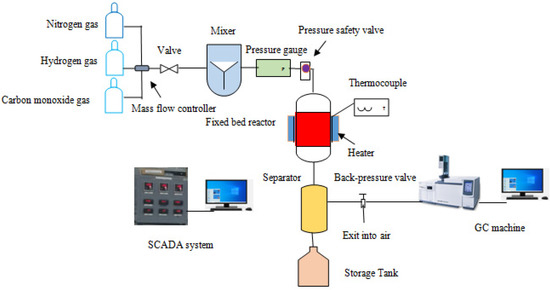 A Fischer–Tropsch synthesis (FTS) system with a fixed-bed reactor was used to assess the catalytic performance. In the reactor, one gram of the prepared catalyst (Fe-C or Fe-C-K) was loaded. The catalyst was reduced for 5 h in a fixed bed reactor at 450 °C with a hydrogen gas flow of 30 sccm and a nitrogen gas flow of 10 sccm. The reactor was cooled to 350 °C to promote the reaction at 20 bar in the presence of a H2/CO (1:1 ratio). The pressure was controlled using a back-pressure regulator. A liquid product sample was taken from the two separators. Gas chromatography was used to evaluate the tail gases in real time (Shimadzu GC-2010 Plus, Kyoto, Japan). Gas chromatography–mass spectrometry was used to assess the liquid sample taken from the separator (GCMS-QP2020, Shimadzu Japan). The product selectivity was calculated using the peak area from the GCMS results. Figure 10 depicts the schematic diagram of the FTS plant that was employed in this experiment.