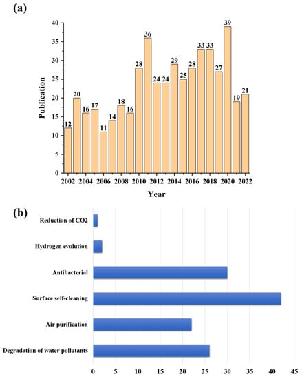 The investigation of traditional GCs and functional transparent glass ceramics (TGCs) has been reviewed in previous papers and books [19,20,21,22,23,24,25]. However, in recent years, numerous researchers have made new explorations and discoveries in GC systems, manufacturing processes and applications. In the past 20 years, the total number of papers in the field of photocatalytic glass ceramics (PGCs) has increased, and research is, generally, developing further and receiving more attention (Figure 1a). In the past decade, the application of PGCs in the environmental field has mainly focused on surface self-cleaning, antibacterial, water pollution degradation and air purification, but the application of hydrogen evolution and carbon dioxide reduction remains to be studied (Figure 1b). At present, there is little review on the performance improvement and rational design of PGCs. At the same time, few researchers have analyzed the conflicting properties of transparency and crystallinity in detail to discuss the balance between them, let alone systematically summarize and generalize the preparation and modification methods to improve the photocatalytic performance of PGCs. Therefore, this review is compiled to discuss the recent advances in GCs, focusing on the preparation and performance improvements of GCs as photocatalytic materials. Firstly, we introduce the classification of PGCs, including its advantages and applications, with a summarization of the photocatalytic mechanism. Furthermore, the key points of PGCs design were reviewed, including the control of transparency and crystallization for GCs and techniques to achieve better photocatalytic performance. At the end of this paper, a brief generalization of the review was summarized so as to forecast the future research direction of PGCs.