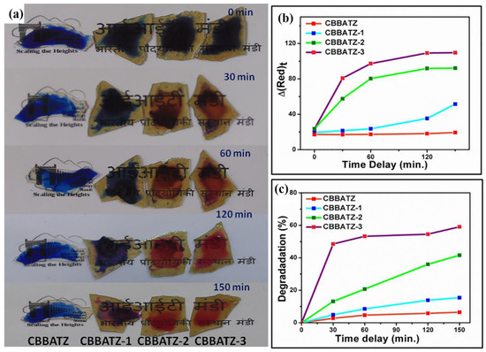 (a) Digital photographs of CBBATZ, CBBATZ-1, CBBATZ-2 and CBBATZ-3 samples at time t = 0, 30, 60, 120 and 150 min during an ink test. (b) Ct/C0 vs. time plot for all samples. (c) Percentage degradation in absorbance of MB dye with time for all samples. Reprinted with permission from Ref. [44].