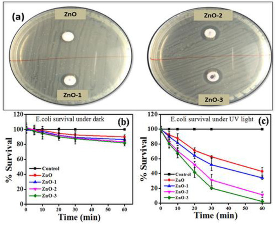 Antibacterial activity of ZnO glasses. (a) Disk diffusion test. Survival (in %) of E. coli after treatment with ZnO glasses (plate form) (b) under dark and (c) under UV irradiation (360 nm). Reprinted with permission from Ref. [48].