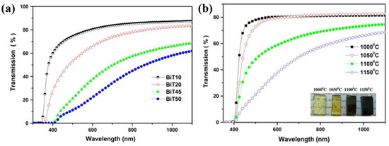 Actually, the magnitude of transparency of GCs affected by crystallite size and refractive index difference is mainly determined by chemical composition and the heat treatment process. Prasad et al. [55] reported the transparent glasses in the composition (100 − x)Li2B4O7-x(SrO-Bi2O3-Nb2O5) (where x = 10, 20, 30, 40, 50 and 60, in molar ratio) and obtained the compositional dependence of the refractive indices at 570 nm of the GCs. The result indicated that the refractive index increased notably with the increase in the SrBi2Nb2O9 composition x. In addition, Molla et al. [56] fabricated Bi4Ti3O12 (BiT) crystals in the K2O-SiO2-Bi2O3-TiO2 (KSBT) system by conducting controlled heat treatments at different temperatures and durations. From the spectra in Figure 8a, it is seen that with increasing BiT content in the glass at 1150 °C, transmission of the glass in the wavelength range of 300–1100 nm decreases. In addition, the effect of melting temperature on the transmission properties of BiT45 glass was investigated, and the transmission properties in the visible wavelength range decreased significantly with increasing melting temperature (Figure 8b).