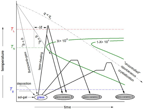 The fabrication of GCs can be viewed as the synthesis of crystals through solid-state confined reactions in supercooled glass. The crystals formed in the glassy matrix are the product of the reaction between the glass components, yet in the solid state. This solid-state reaction can be triggered by increasing the temperature (i.e., thermal treatment), which is the most popular technique for GC fabrication. Glass can be made by fusion quenching techniques above liquid temperatures. A schematic diagram of glass’ transition to GC is shown in Figure 9. In most instances, the cooling rates should be greater than the critical rate to obtain glass (q > qc), where , with TN being nose temperature and t being time. TN represents the temperature at which the crystal fraction of 10-6 is achieved in the shortest time (δt). GCs are usually obtained from parent glass by heat-treating for crystal nucleation and growth. Some GCs are formed directly during cooling from melt using cooling rate q ≤ qc. 2Bi2O3-B2O3 (BBO), TGC is obtained by melt-quenching and heat treatment [62]. The XRD of an as-quenched sample illustrates the presence of nanocrystals, which indicates that a small amount of crystals is precipitated during the cooling of the melt. Moreover, with heat treatment of the as-quenched glass at 380 °C for 1, 2 and 3 h to control the crystallization process, the samples all precipitated Bi4B2O9 crystals.