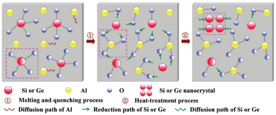 Precipitation of elemental particles in a glass matrix can be accomplished by thermal decomposition of unstable precursors or reduction with reducing agents to form elemental particles. At the melting temperature, the precursor salt (e.g., AgCl) is completely solvated, and then the precursor is reduced to form an atomically noble metal species. If atomic or molecular state elements are present in the glass melt, they may be in the quenched structure. During the subsequent heat treatment, these metal atoms aggregate, grow and form larger nanocrystals through atomic diffusion. That is to say, the desired metal species can be induced into the glass melt by addition of these metal species through raw materials or redox reactions. Lin et al. [57] used a metallic reducing agent (metallic Al) to reduce other metal or semiconductor oxides (for example, GeO2) to their atomic state (Ge) by melt-quenching processes (process 1 in Figure 10). During subsequent heat treatment (process 2 in Figure 10), this semiconducting element (Ge) will aggregate in the atomic state, grow and form nanocrystals by atomic diffusion inside the glass. This redox reaction can be carried out in a glass matrix: at the glass transition temperature, metal Al is completely dissolved in the glass grid, forming a homogeneous “solution” at high temperature, which can be quenched to form a colorless transparent glass. Utilizing the redox equilibrium established between the reducing agent and various oxides forms crystal nuclei in the melt quenching stage. During the subsequent heat treatment stage, the redox reaction leads to the reduction in the glass network and diffusion to grow nanoparticles on the nuclei (see Figure 10). The particle size can be well controlled by the heat treatment temperature and holding time—a higher reaction temperature favors the formation of crystalline particles with larger average particle size.