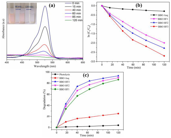- Liu, S.; Yin, K.; Ren, W.; Cheng, B.; Yu, J. Tandem photocatalytic oxidation of Rhodamine B over surface fluorinated bismuth vanadate crystals. J. Mater. Chem. 2012, 22, 17759–17767. [Google Scholar] [CrossRef]
