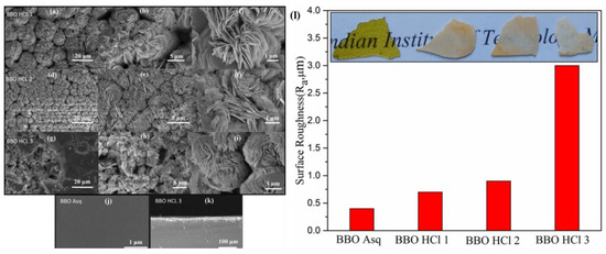 SEM images of (a–i) BBO HCl etching samples, (j) BBO as-quenched samples and (k) a typical cross-sectional image of the BBO HCl 3. (l) Surface roughness and images of BBO glass samples. Reprinted with permission from Ref. [113].