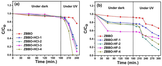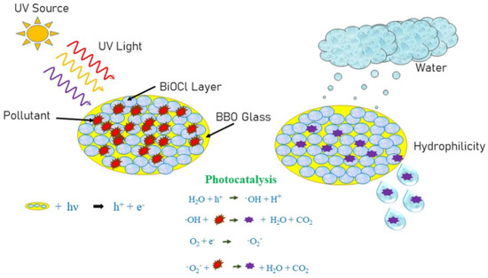This arrangement stacks layer by layer along the c axis with weak interlayer van der Waals interactions [135]. The layer by layer and alternate stacking sequence of “-(Cl-Bi-O-Bi-Cl)-” along the (001) plane lead to semicircular plates/petals and automatically assemble as the flower- or cabbage-like structures. Increasing the concentration of HCl for etching of BBO creates pores as well as cracks, which increases the surface roughness, but excessive etchings with HCl decreased the transparency of the BBO, and its color changed from yellow to white, respectively (Figure 13l). Therefore, the etching process needs to be optimized to obtain better transparency and superior photocatalytic performance. A typical schematic diagram for the degradation of pollutants by HCl-etched BBO GCs under UV light irradiation is shown in Figure 14. Due to the absorption of photons with energy greater than or equal to the energy of the material, an electron is excited from the valence band to the conduction band, thereby forming an electron pair and a positive hole. These photoinduced positive holes and electrons undergo a series of reactions and finally produce hydroxyl (∙OH) radicals and superoxide radicals (·O2−). An HCl-etched BBO GC is irradiated with ultraviolet rays; with the help of superoxide ions as well as hydroxyl radicals, the harmful pollutants are reduced to harmless products. Photocatalytic experiments on BBO glass samples etched with different concentrations of HCl showed that the degradation rate of methylene blue by BBO HCl3 glass was the highest, reaching almost 100% within 180 min. With the further increase in HCl concentration, the penetration depth in the glass sample increases, and more and more nucleation sites are formed, which further promotes the growth of BiOCl. BiOCl grows and is densely arranged along the (110) plane to form the flower-like hierarchical structure assembled with petals, which is conducive to absorbing the best solar radiation and reducing annihilation rate of electron and hole so as to obtain the best kinetic rate of photocatalytic reaction.