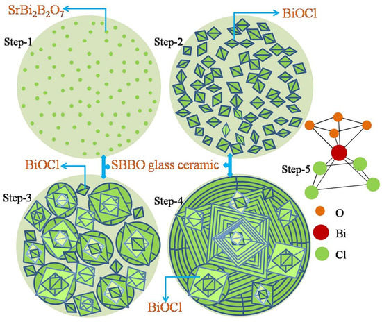 Singh et al. [115] also used HCl chemical etching to obtain the BiOCl layered structure over the SrO-Bi2O3-B2O3 (SBBO) TGC. The schematic diagram is shown in Figure 15. Step 1 illustrates the distribution of SrBi2B2O7 nano-sized crystals on the surface of the SBBO GC due to the optimization of melting and quenching temperatures. Step 2 is SBBO BiOCl-1 GC formed by etching SBBO GC by HCl, showing a network of triangle and quadrilateral cross-sections of semicircular plates. With the etching of SBBO GC, HCl reacts with Bi in SrBi2B2O7 existing on the surface of the SBBO GC. Further increasing the etched HCl concentration, the dissolution of SrBi2B2O7 and the recrystallization of the BiOCl semicircle plate occur simultaneously, and the flower’s morphology is assembled by a large number of ultra-long plates or nanosheets, as shown in Steps 3 and 4. The positively charged Bi3+ ions in the SrBi2B2O7 compound react with Cl- ions in HCl solution to form BiCl3. Immediately, BiCl3 hydrolyzes with water and forms a BiOCl polarized structure. The four O atoms and four Cl atoms are attached tetragonally in opposite directions with Bi and construct asymmetric decahedral layered geometry along the c axis, shown in Step 5 [136]. These structures attached along the (001) plane in the stacking order of -(Cl-Bi-O-Bi-Cl)-(Cl-Bi-O-Bi-Cl)-(Cl-Bi-O-Bi-Cl)-. They form semicircular plates/petals, flowers or cabbage and other layered structures in SBBO GCs etched with different concentrations of HCl. Therefore, the kinetic rate of degradation of MB for respected SBBO-BiOCl GCs increases with the increase in the concentration of SBBO etched by HCl. Their team also achieved the controlled crystallization on the surface of ZnO-Bi2O3-B2O3 glass via etching using HCl/HF, respectively [116]. Using four different concentrations of acid (3, 6, 9 and 12 M), different amounts of BiOCl and BiF3 surface crystals were obtained. As reported by Sharma [113], the morphology of the glass samples changed from plate-shaped particles to flower-shaped particles with the increasing concentration of etching acid. Additionally, the transparency was decreased with an increase in the concentration of acid used for etching owing to the increase in glass surface roughness. Compared with BiF3 surface-crystallized glass, BiOCl surface-crystallized glasses have more efficient photocatalytic performance. Under ultraviolet irradiation (UV), methylene blue was completely degraded by a BiOCl crystallized sample within 225 min, while maximum 90% degradation was achieved in a BiF3 crystallized sample, even after 300 min (Figure 16). It is due more to the narrow band gap values of BiOCl than those of BiF3 and also due to the presence of an internal electric field in the BiOCl layered structure, which prevents electron–hole pair re-combinations. The superior self-cleaning properties of BiOCl crystallized glasses were mainly due to the enhanced hydrophobicity of BiOCl crystallized glass compared with BiF3 crystallized glass.