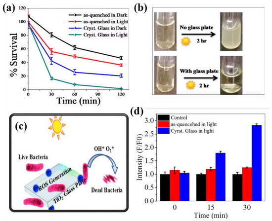 - Kumar, S.; Kushwaha, H.S.; Singh, V.P.; Vaish, R.; Ilahi, B.; Madhar, N.A. Solar light induced antibacterial performance of TiO2 crystallized glass ceramics. Int. J. Appl. Glass Sci. 2018, 9, 480–486. [Google Scholar] [CrossRef]
