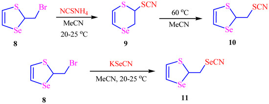 The reaction of thiaselenole 8 with ammonium thiocyanate (acetonitrile, room temperature, 3 h) was accompanied by a rearrangement with ring expansion affording 2,3-dihydro-1,4-thiaselenin-2-yl thiocyanate (9) in 95% yield (Scheme 1) [55]. However, when the reaction was carried out at 60 °C for 25 h, five-membered 1,3-thiaselenol-2-ylmethyl thiocyanate (10) was obtained in 40% yield as a result of rearrangement of six-membered thiocyanate 9 [55]. The compound 10 was believed to be a more stable thermodynamic product, while six-membered thiocyanate 9 was considered a kinetic product.