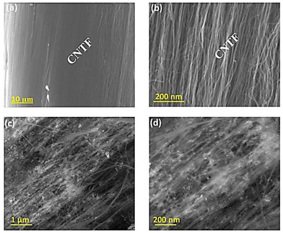The morphological features of bare CNTF and Co4POM@CNTF were investigated through SEM analysis. Figure 1a,b show the SEM images of bare CNTF at different magnifications. The SEM images of Co4POM@CNTF show that Co4POM was uniformly distributed on the surface of CNTFs (Figure 1c,d).