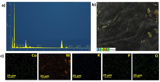 Furthermore, Co4POM@CNTF was characterized through energy-dispersive X-ray (EDX) spectroscopy to identify its elemental composition. Figure 2a shows that cobalt (Co), tungsten (W), phosphorus (P), oxygen (O), potassium (K) and sodium (Na) were all present in the modified electrode that stemmed from Co4POM. A peak observed in the range from 0.1 to 0.2 keV was assigned to carbon, which is attributed to the CNTF substrate. The peak between 6.2 and 6.6 keV was of iron (Fe) and arose because of the iron catalyst used for the synthesis of CNTF through chemical vapor deposition (CVD) method [50]. Figure 2b illustrates the EDX-layered image depicting that all the components (colored dots) of Co4POM were uniformly spread throughout the surface of CNTF. Furthermore, elemental mapping supported the presence of the corresponding elements in the fabricated electrode (see Figure 2c).