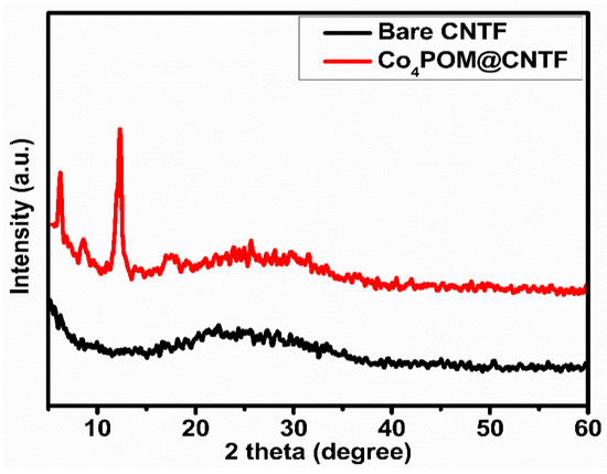 The fabricated electrode was characterized through X-ray diffraction analysis (XRD). Figure 3 shows that CNTF had an amorphous pattern, whereas that of Co4POM@CNTF had prominent peaks at 6°, 8°, and 12° 2θ values, which confirmed the deposition of Co4POM on the surface of CNTF. The peaks at 2θ values from 22° to 32° were not dominant due to the presence of the amorphous CNTF phase.